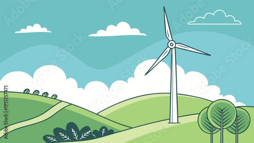 Природный пейзаж зеленых холмов, векторная иллюстрация в стиле бумажного искусства. Летняя сельская сцена с красивыми холмами, полем, лугами, деревьями, ветряными мельницами, небом, облаками, солнцем. Сельский природный пейзаж.