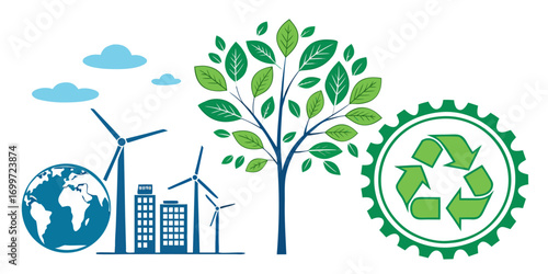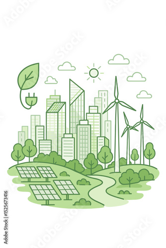 Зеленый лист с ветряными мельницами и солнечными батареями, деревьями, силуэтами городских зданий, векторная иллюстрация в стиле бумажного искусства. Сохраняйте окружающую среду, экологию. Концепция зеленой энергии.