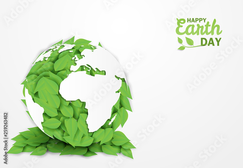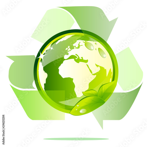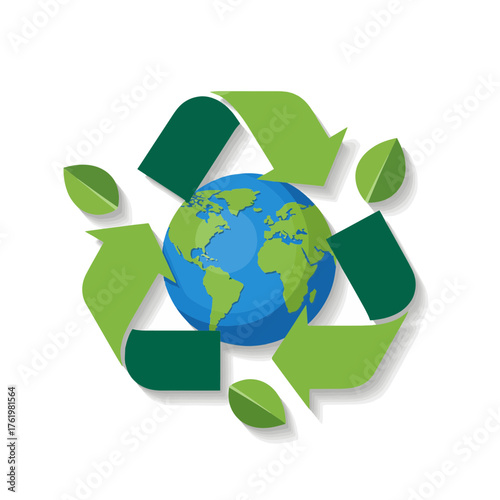 Зеленый знак переработки отходов и глобус планеты Земля, векторная иллюстрация в стиле бумажного искусства. Символ повторного использования отходов и вторичной переработки, этикетка. Всемирный день окружающей среды. Спасите планету.