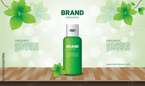 Шаблон рекламы зеленого чая, векторная иллюстрация. Коробка для упаковки травяного чая и макет чайного пакетика, вырезанные из бумаги зеленые листья и плантации.