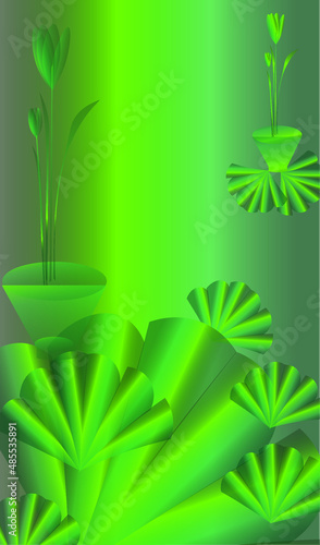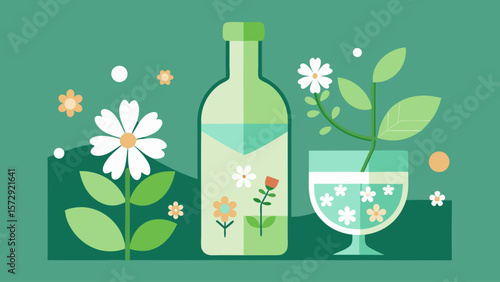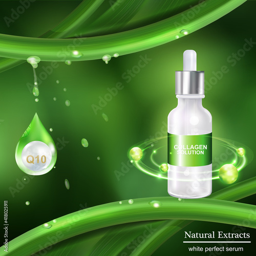 Шаблон косметической рекламы зеленого чая, векторная иллюстрация. Макеты белых пустых косметических флакончиков, вырезанные из бумаги зеленые листья в стиле крафт, поля. Средства для красоты и ухода за кожей с экстрактом чая.