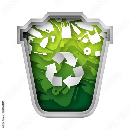Зеленый мусорный бак с пластиковым мусором, векторная иллюстрация в стиле бумажного искусства. Сортировка и переработка отходов, экологическая концепция для веб-баннера, страницы веб-сайта и т.д.
