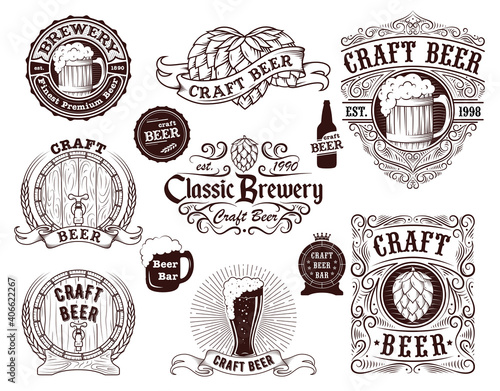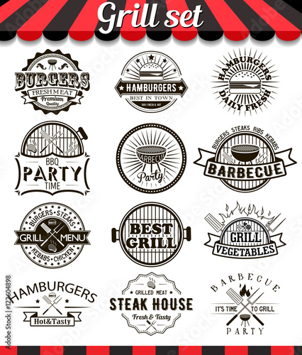 Винтажный логотип гриля или барбекю, этикетка, набор значков, векторная иллюстрация. Гамбургер, стейк, кебаб, курица, овощи на гриле черные эмблемы на белом фоне. Стейк-хаус, логотипы барбекю-вечеринок.