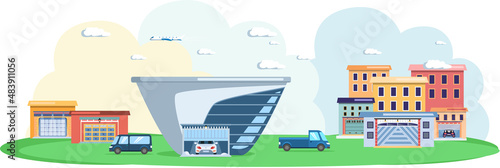 Продуктовый магазин, шаблон векторного плаката фермерского рынка. Продовольственный магазин, интерьер супермаркета с бананами, яблоками, арбузами, молочными продуктами, оливковым маслом, фруктовыми консервами на полках, плоская иллюстрация.