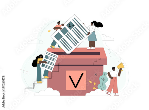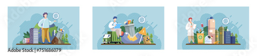 Группа экологов, заботящихся о глобусе планеты Земля. Люди выращивают растения, устанавливают солнечные панели, сортируют отходы для вторичной переработки, плоская векторная иллюстрация. Экологически чистый образ жизни, экономия окружающей среды.