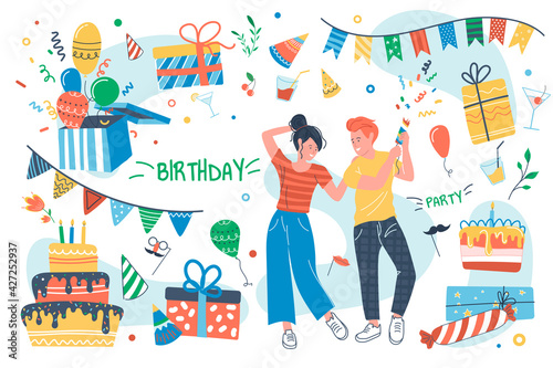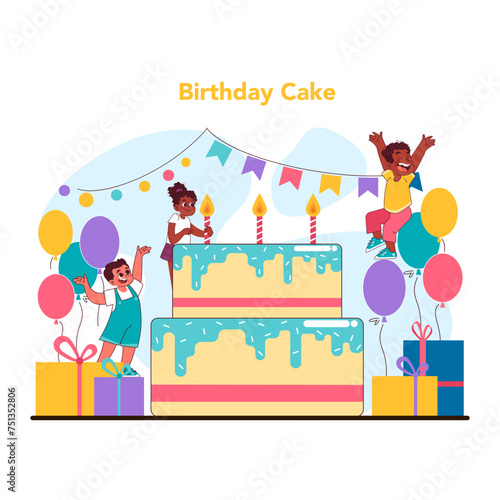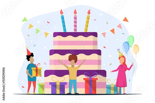 Группа деловых людей празднует день рождения, векторная плоская иллюстрация. Вечеринка по случаю дня рождения с друзьями, коллегами и большим тортом со свечами, подарками.
