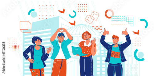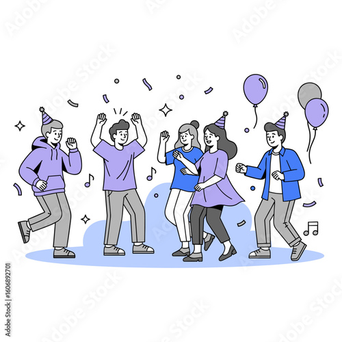 Группа счастливых друзей, собравшихся вместе на праздничной вечеринке, векторная иллюстрация. Молодые мужчины и женщины пьют коктейли и весело разговаривают, разделяя веселое настроение