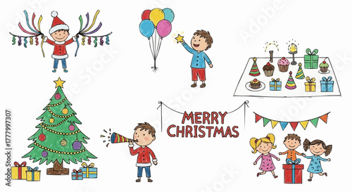 Группа людей, празднующих Рождество онлайн, плоская векторная иллюстрация. Онлайн-вечеринка, технологии видеоконференцсвязи, дистанционная встреча.