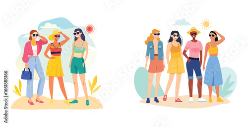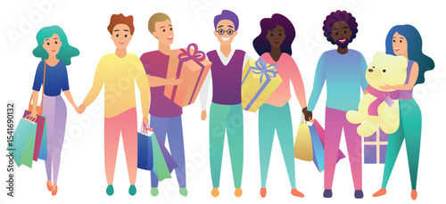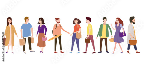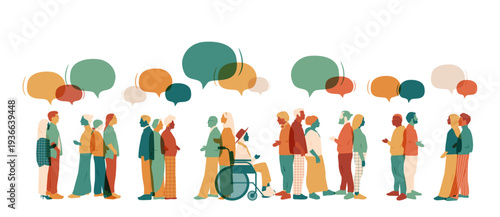 Группа людей с мобильными телефонами и речевыми пузырями, векторная иллюстрация. Модные молодые мужчины и женщины разговаривают по мобильному телефону, общаясь через Интернет.