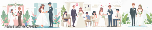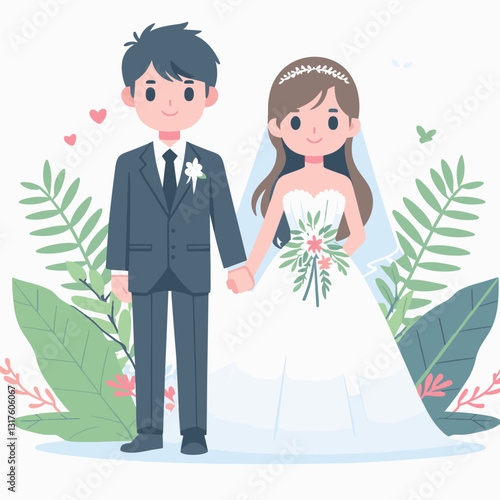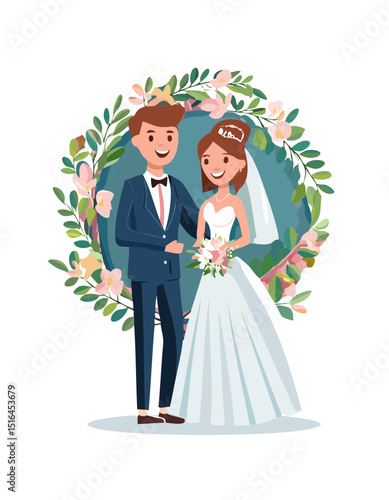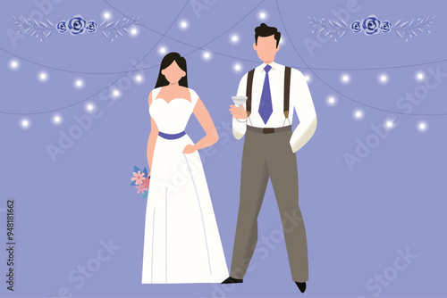 Гости дарят свадебные подарки молодоженам векторная иллюстрация. Персонажи "Супружеская метла" и "невеста" улыбаются, предвкушая эмоции от получения подарков
