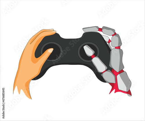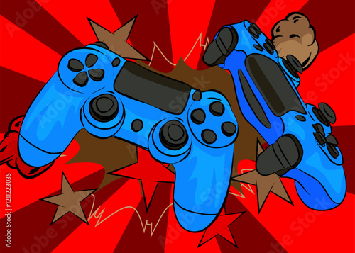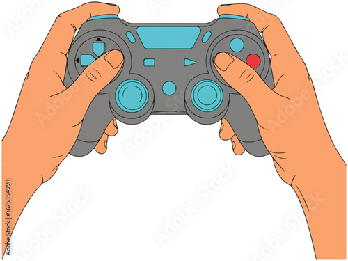 Руки парней держат геймпад перед экраном телевизора или компьютера с векторной иллюстрацией видеоигры. Мужчины играют в видеоигру о автомобильных гонках на консоли. Соревнование по игровым играм для людей бросает вызов