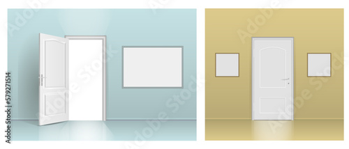 Двери холла с лифтом реалистичный векторный дизайн интерьера. Коридор в гостинице, иллюстрация пустого коридора общежития. Предыстория архитектуры