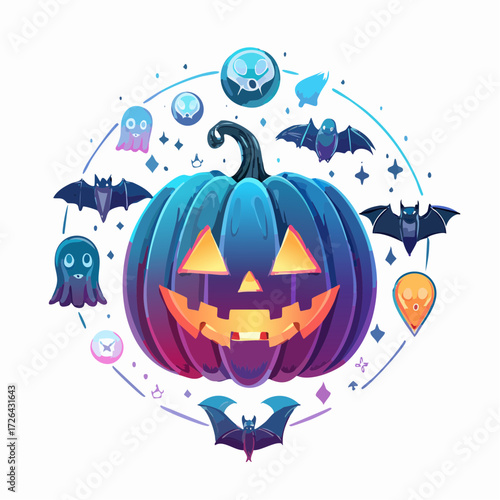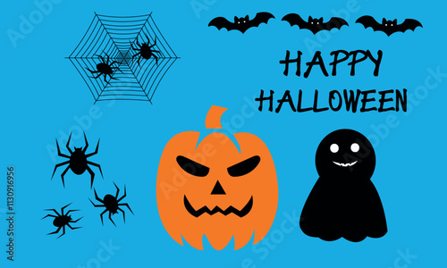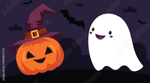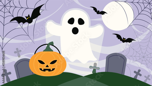Изометрический 3d-вектор призрака Хэллоуина. Фон ужасов со страшным ночным костюмом для угощения или розыгрыша счастливой октябрьской вечеринки. Забавный призрачный персонаж с плакатом тыквы, летучей мыши и паука