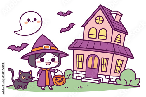 Женщина в сексуальном костюме медсестры на Хэллоуин. Иллюстрация концепции праздничной вечеринки Хэллоуина. Векторный шаблон дизайна веб-сайта. Женщина играет в трюк или угощение и носит платье ведьмы.