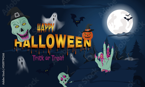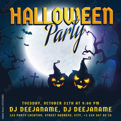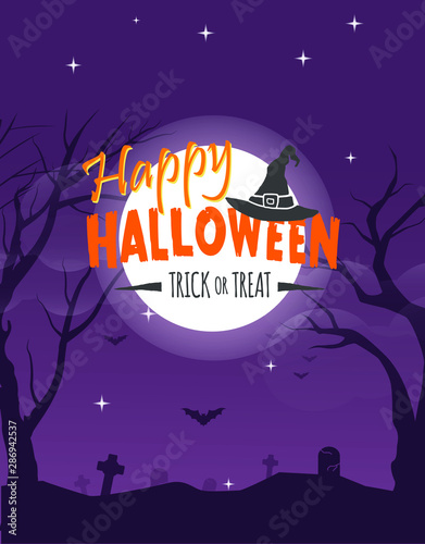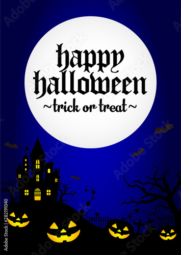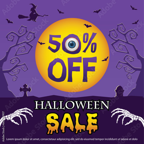 Рекламный плакат распродажи Хэллоуина с тыквами, домом с привидениями, летучими мышами, ночным фоном с полной луной, копировальным пространством, векторной иллюстрацией в стиле бумажного искусства. Специальное предложение, промо-акция со скидками.