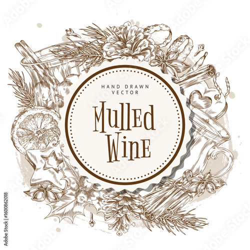 Нарисованный от руки векторный круглый баннер с глинтвейном. Черно-белый эскиз плаката. Шаблоны дизайна логотипа и эмблемы меню в ретро винтажном стиле
