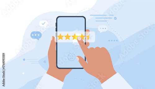Изометрическая векторная иллюстрация, держащая в руке смартфон с рейтингом пять звезд. Онлайн-опрос удовлетворенности потребителей отзывами о качестве продукта или услуги. Мобильное приложение для оставления отзывов