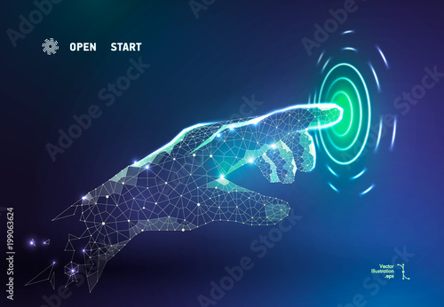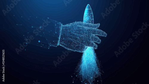 Векторный полигональный художественный стиль человеческих рук. Низкополигональная каркасная сетка с рассеянными частицами и световыми эффектами на темно-синем фоне. Шаблон дизайна баннера плаката концепции рукопожатия.