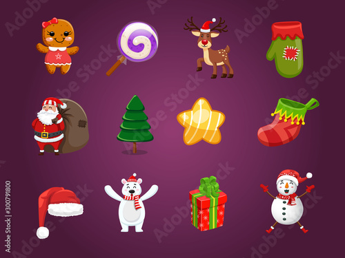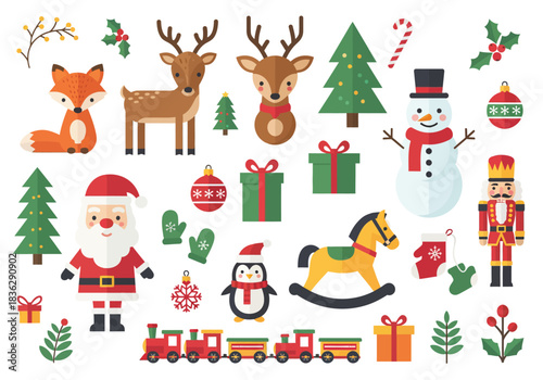 Счастливые рождественские животные, забавные мультяшные персонажи, плоская векторная изолированная иллюстрация. Милый ежик, олень, кролик, лиса, белка, котенок и медведь с рождественскими украшениями для поздравительной открытки, наклейки, принта