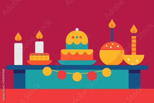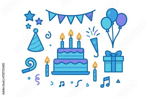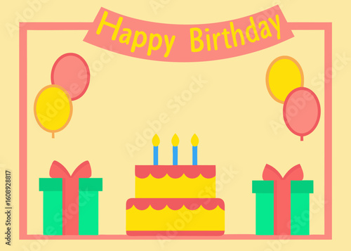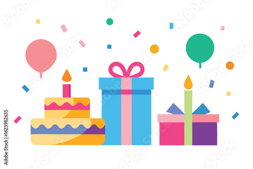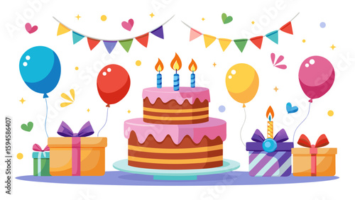 Украшение с днем рождения. Шаблон поздравительной открытки с 3d векторной иллюстрацией торта и свечей, шоколада, праздничных колпачков, подарочной коробки и хлопушек из конфетти