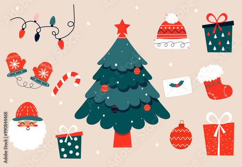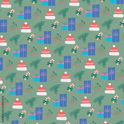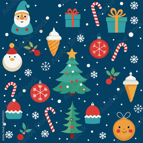 Векторный бесшовный узор с милым енотом и пандой, одетыми в праздничные шляпы и подарочные коробки, конфеты, кексы, партийные вымпелы вокруг них. Фон с днем рождения, обои, ткань, оберточная бумага.