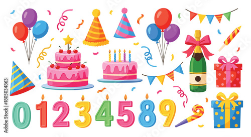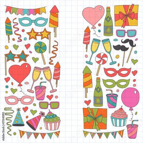 Векторный бесшовный узор с украшениями для вечеринок. Праздничный торт, сладости, подарочные коробки, воздушные шары и праздничные флаги. Фон с днем рождения, обои, ткань, оберточная бумага.