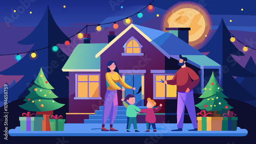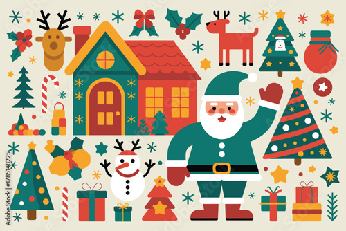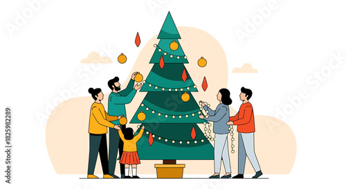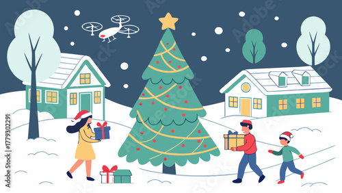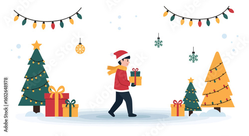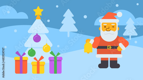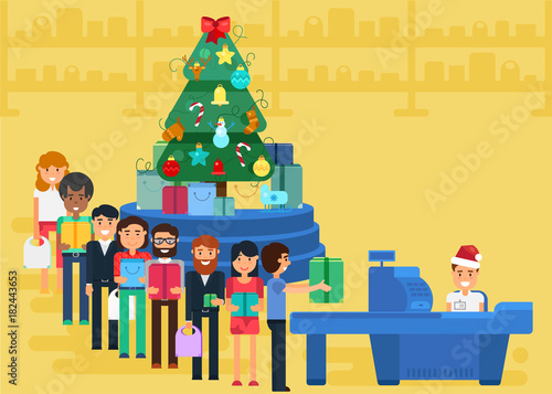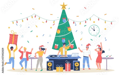Счастливые деловые люди празднуют Счастливое Рождество и Счастливый Новый год, векторная плоская иллюстрация. Новогодний бал, вечеринка с ди-джеем, рождественская елка. Персонажи мужского и женского пола дарят подарки, танцуют, веселятся.