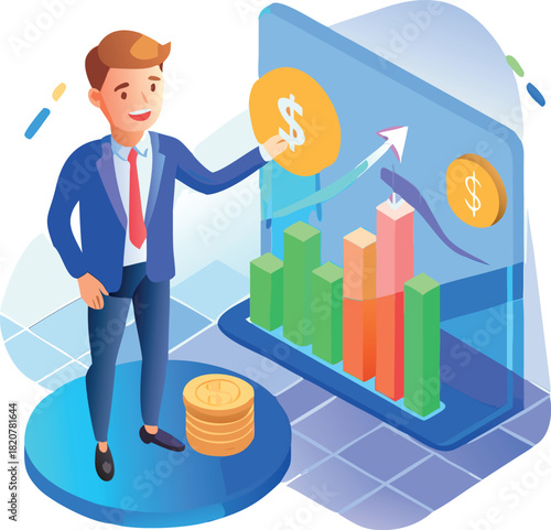 Счастливый бизнесмен, держащий долларовую монету в поднятых руках, стоя на вершине гистограммы, плоская векторная изометрическая иллюстрация. Успешный инвестор празднует финансовый успех.
