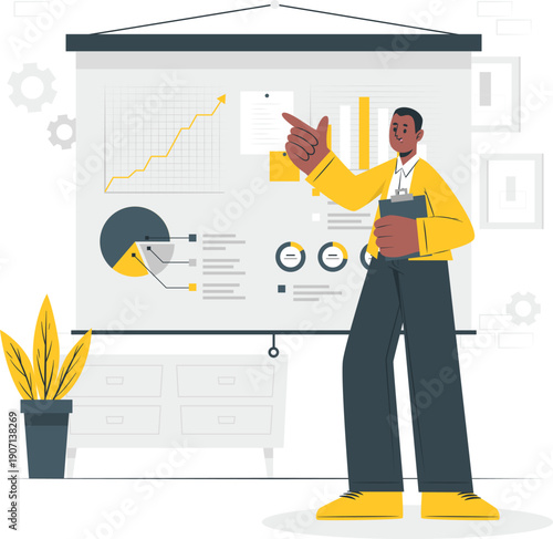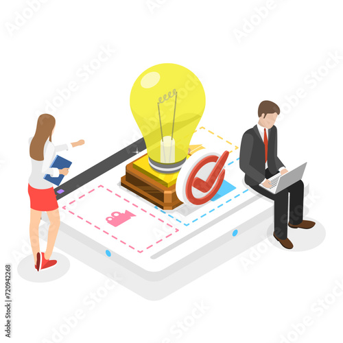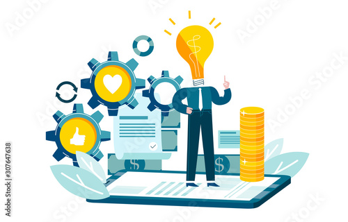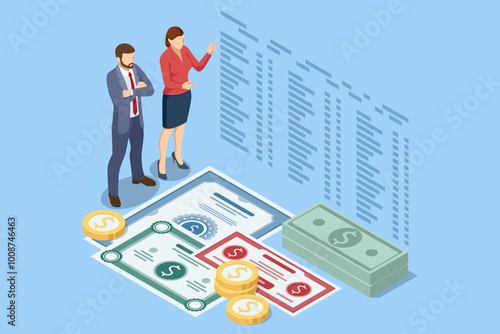 Счастливый бизнесмен, держащий долларовую монету в поднятых руках, стоя на вершине стопки монет, плоская векторная изометрическая иллюстрация. Концепция финансового менеджмента.