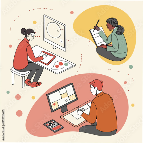 Счастливые дети, играющие с игрушкой-роботом или программирующие умного робота, плоская векторная иллюстрация. Школа робототехники, детский инженерный клуб, класс робототехники.