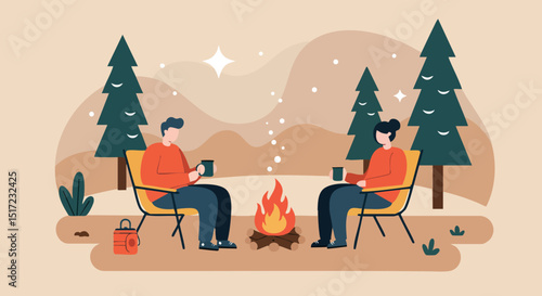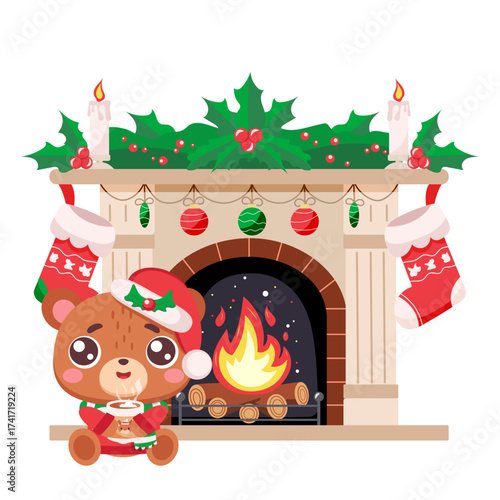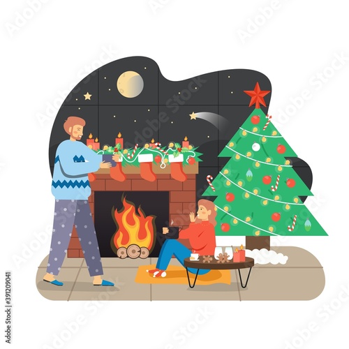 Счастливая пара празднует Новогоднюю ночь, Рождественские каникулы вместе дома, плоская векторная иллюстрация. Интерьер гостиной с украшенным камином, рождественской елкой. Романтическая ночь у камина.