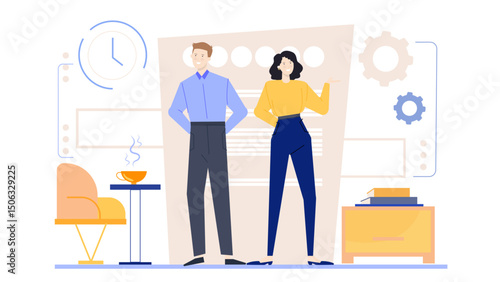 Счастливая пара вешает свет на окно в прихожей, плоская векторная иллюстрация. Украшение дома, обустройство дома.