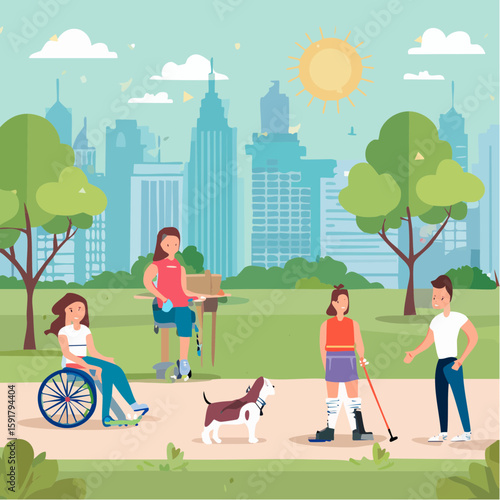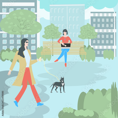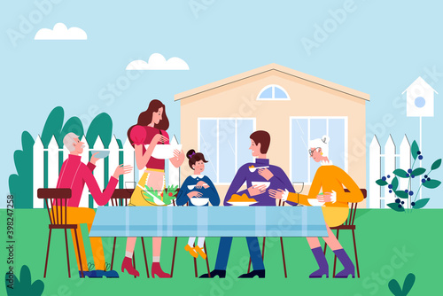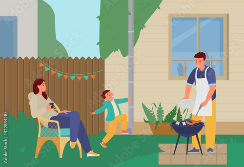 Счастливая пара устраивает вечеринку с барбекю на заднем дворе, плоская векторная иллюстрация. Молодой человек жарит мясо барбекю на гриле, женщина играет с домашней собакой, сидя на стуле под зонтиком. Летний пикник на открытом воздухе, барбекю.