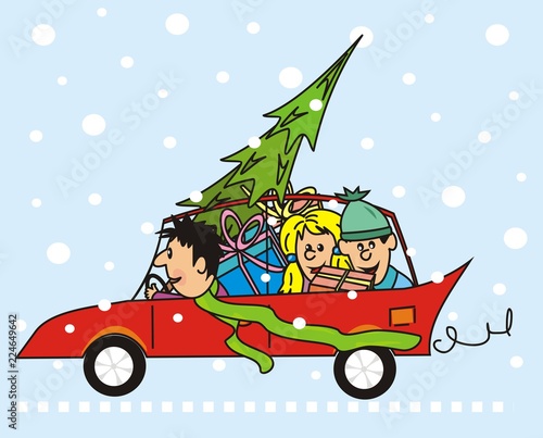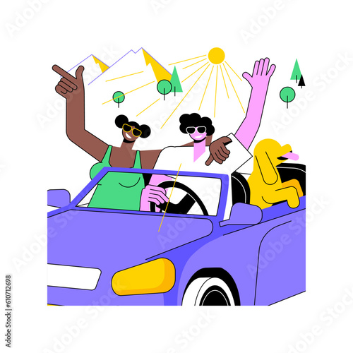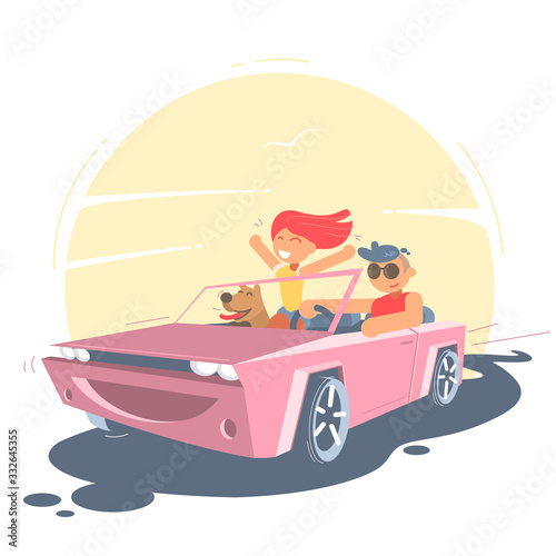 Счастливая пара в отъезжающей машине. Векторная иллюстрация в стиле ретро поп-арт. Концепция любовного романа.