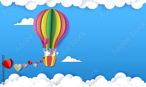 Счастливая пара, летящая на воздушном шаре, векторная иллюстрация в стиле многослойной поделки из бумаги. Поздравительная открытка на День Святого Валентина, плакат, шаблон баннера с местом для копирования.