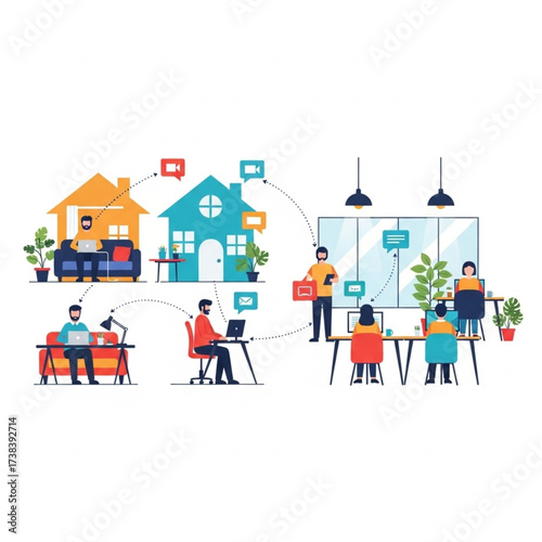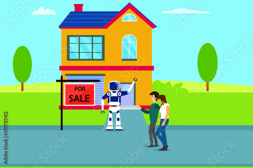 Счастливая пара в жилом здании с замком, щитом и сиреной сигнализации, плоская векторная иллюстрация. Система охранной сигнализации домашней безопасности. Охрана дома, контроль безопасности.