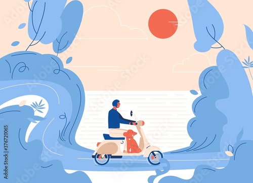 Счастливая влюбленная пара катается на мотороллере, плоская векторная иллюстрация. Летние каникулы, романтический отпуск, медовый месяц.