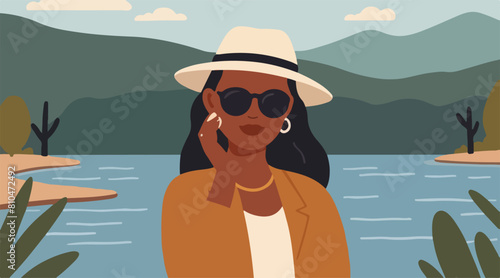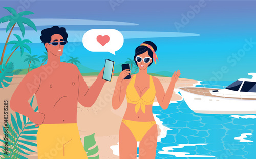 Счастливая пара делает селфи на пляже, плоская векторная иллюстрация. Летние каникулы, пляжный отдых, романтическая поездка, путешествия.