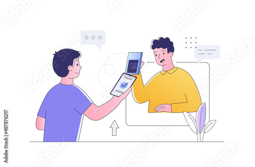 Счастливая пара, использующая векторную иллюстрацию киоска быстрого питания самообслуживания, изолированную на белом фоне