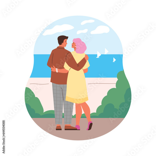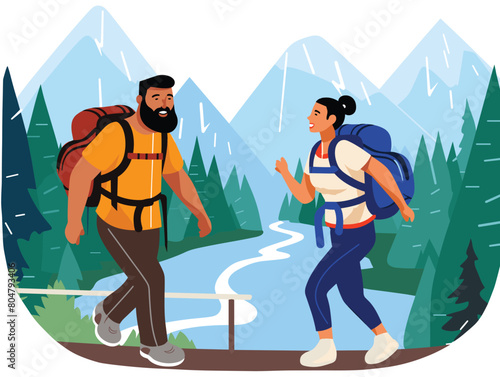 Счастливая пара, гуляющая в лесу или парке, держась за руки, плоская векторная иллюстрация. Путешественники, отправляющиеся в поход, кемпинг, треккинг. Лесной лагерь, летние мероприятия на свежем воздухе, отдых, каникулы.