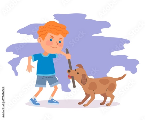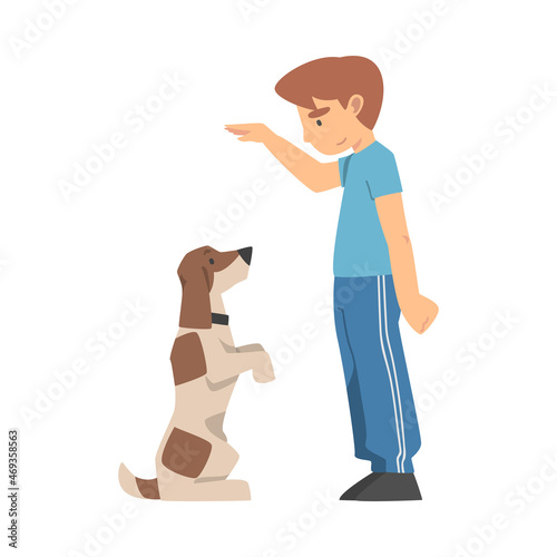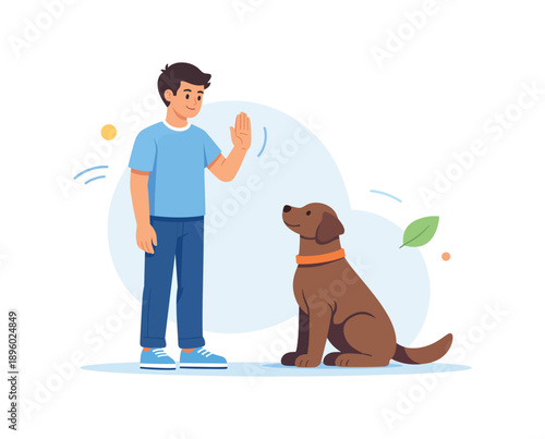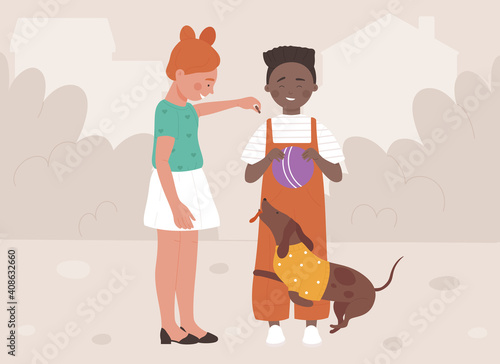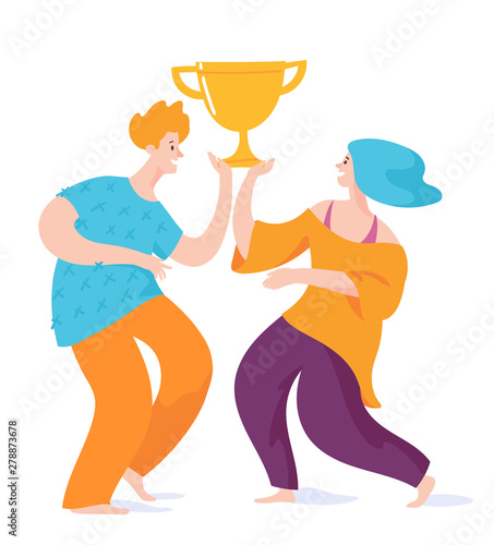 Вектор счастливых победителей выставки собак. Владельцы домашних животных получают награду gold trophy cup и щенка с медалью за иллюстрацию за первое место. Чемпионат по разведению животных, развлекательный турнир. Церемония награждения