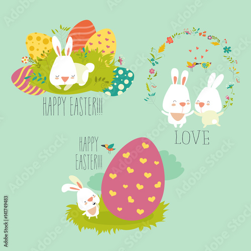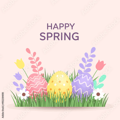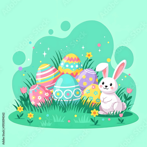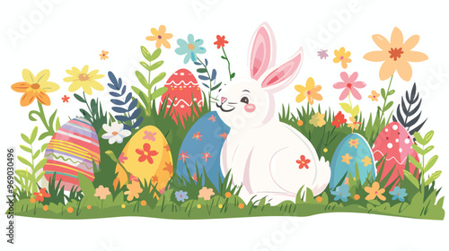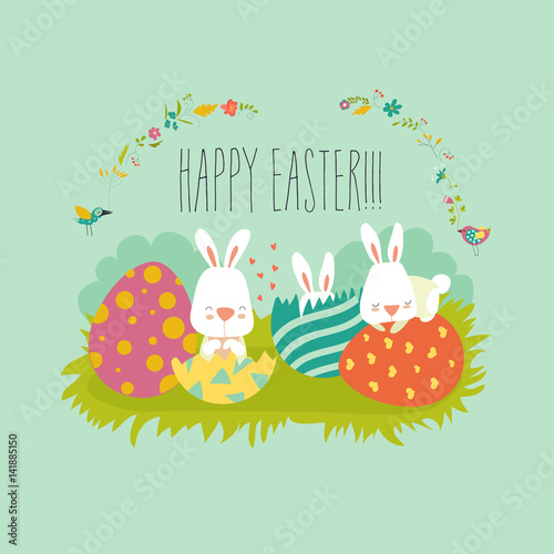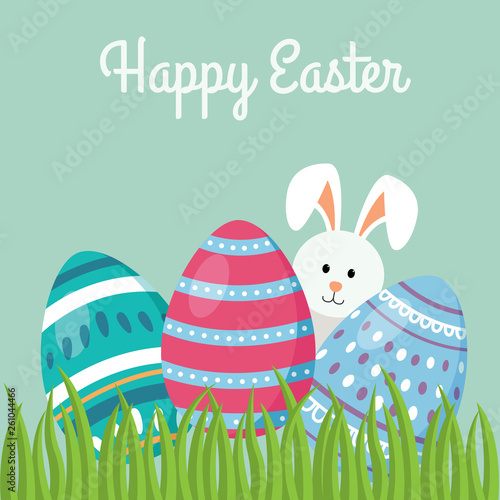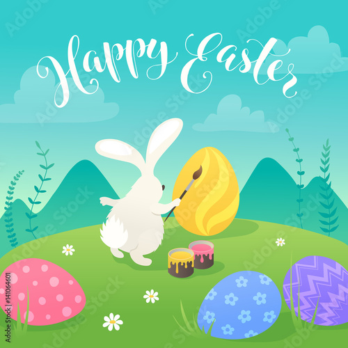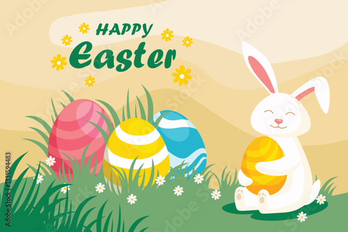 Поздравительная пасхальная открытка с пасхальными яйцами и пасхальным кроликом. Векторная иллюстрация в стиле бумажного искусства.