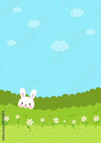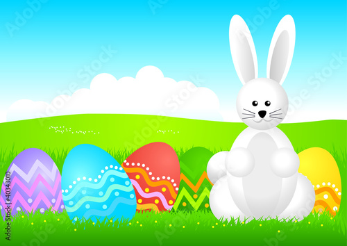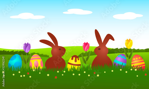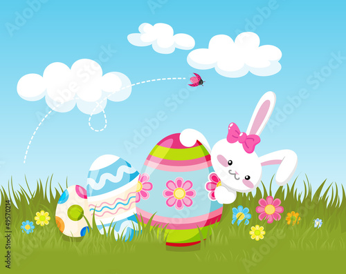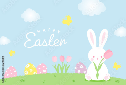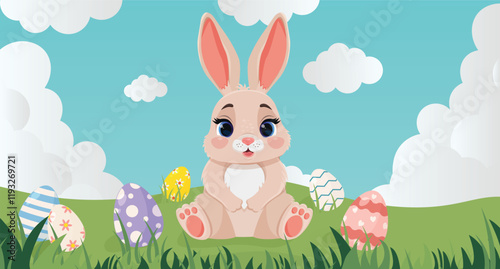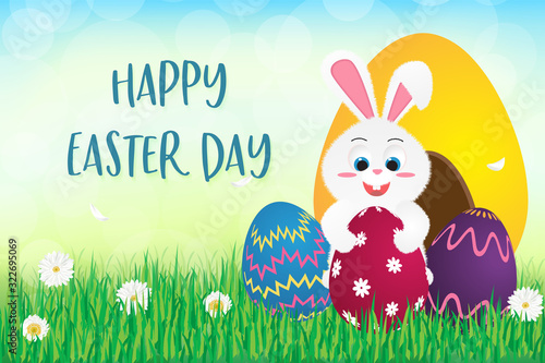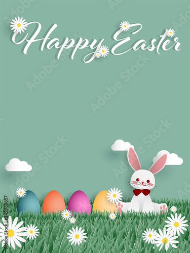 Шаблон баннера с плакатом "Счастливая Пасха", векторная иллюстрация в стиле вырезки из бумаги. Милый кролик сидит в траве и пасхальные яйца.