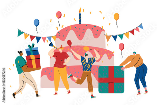 Микро-персонажи, несущие большую пасхальную корзину, раскрашенное яйцо, зажигающие свечу на огромном пасхальном куличе с глазурью, векторная плоская иллюстрация. Концепция празднования весеннего праздника для веб-баннера, страницы веб-сайта и т.д.
