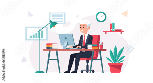 Счастливый бизнесмен-победитель, держащий золотой кубок над головой, плоская векторная иллюстрация. Успешный сотрудник, лучший офисный работник, получающий награду. Карьерный рост, деловые достижения, успех.