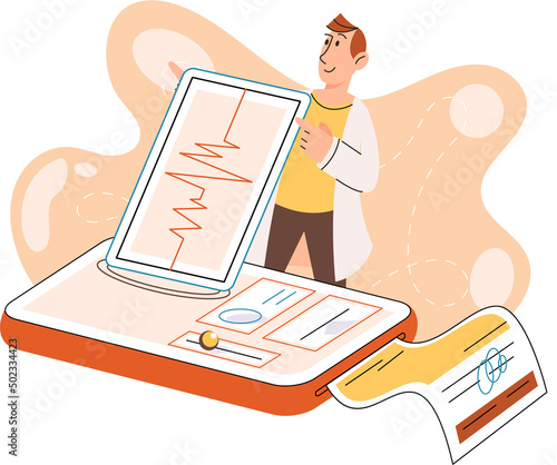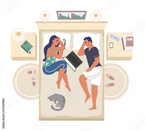 Счастливая семейная пара, лежащая на кровати с векторным значком вида сверху цифрового устройства, изолированным на белом фоне.