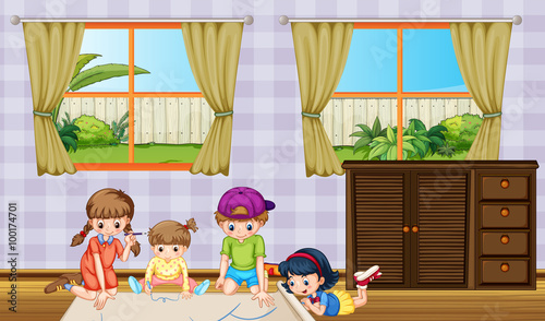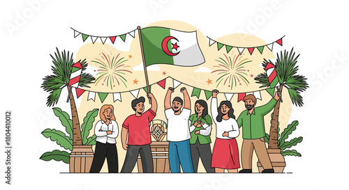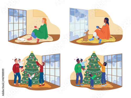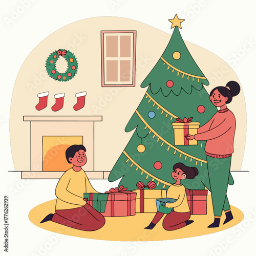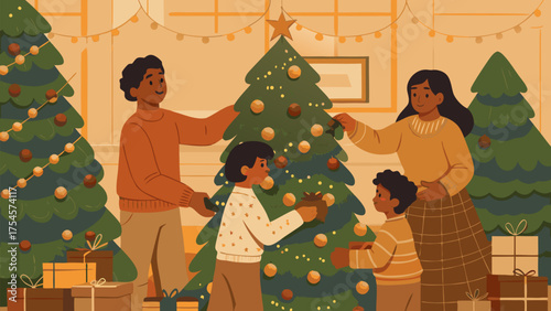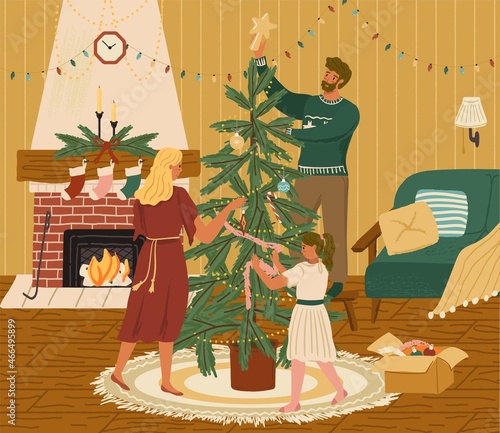 Счастливая семья украшает рождественскую елку украшениями и гирляндами. Люди готовятся к празднованию нового года и Рождества 2022 года. Красочная векторная иллюстрация в рисованном стиле.