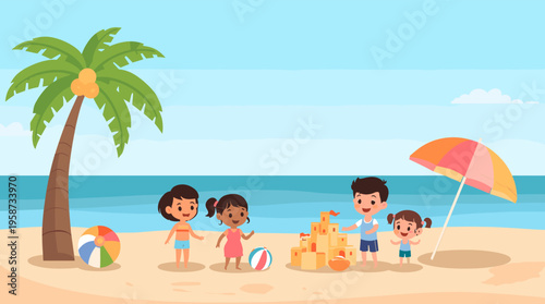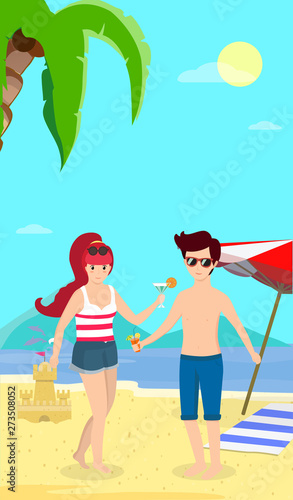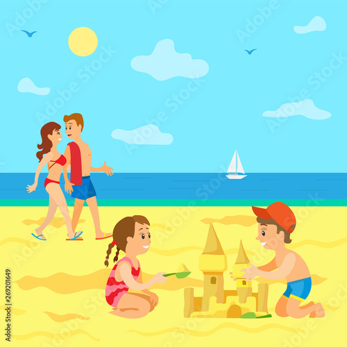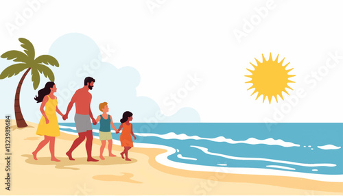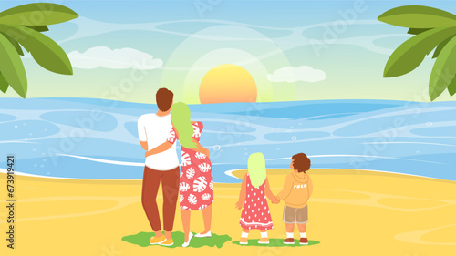Счастливая семья наслаждается закатом на векторной иллюстрации тропического пляжа. Родители и дети вместе гуляют по берегу моря и расслабляются. Концепция отдыха на тропическом курорте