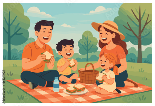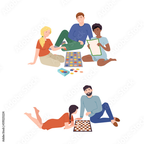 Счастливая семья играет в настольную игру, сидя на ковре, плоская векторная иллюстрация. Родители с детьми проводят время вместе, играя в настольную игру. Домашний досуг и развлечения.