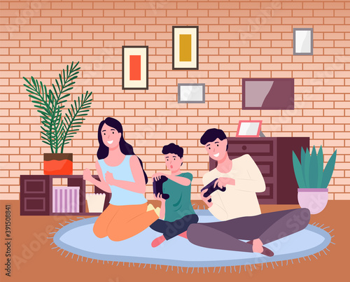 Счастливая семья играет в настольную игру вместе, сидя на полу в гостиной, плоская векторная иллюстрация. Родители с детьми наслаждаются свободным временем, играя в настольную игру дома. Семейные отношения.